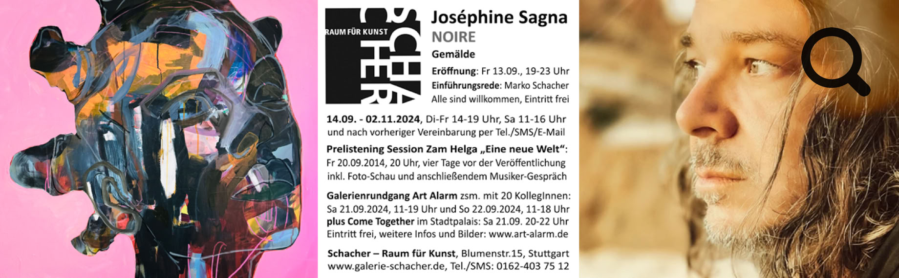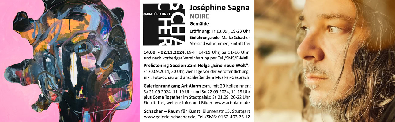 Am Freitag, dem 20. September, 20 Uhr, dem Abend vor dem 21 Institutionen verbindenden Galerienrundgang "Art Alarm", werden Zam Helga und Marko Schacher in den Räumen der Galerie "Schacher - Raum für Kunst" das neue Album "Eine neue Welt" innerhalb einer exklusiven Prelistening Session vorstellen. Adresse: Schacher - Raum für Kunst, Blumenstraße 15/Olgaeck, 70182 Stuttgart. Der Eintritt ist frei. Mehr ….